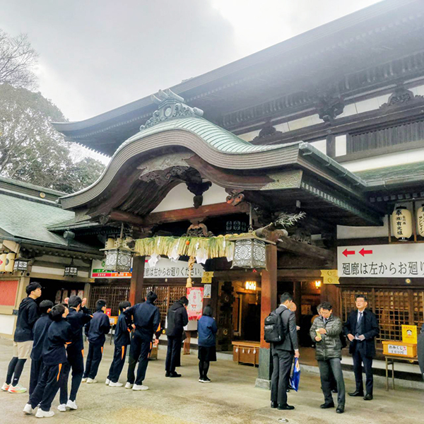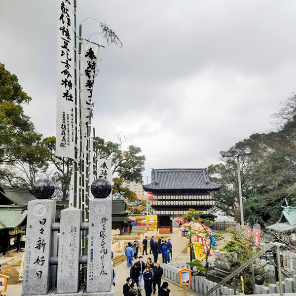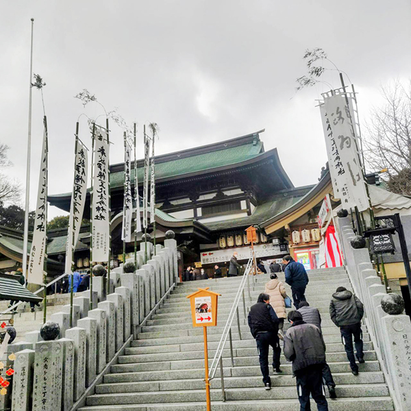 年頭の朝礼があり、その後、お椿さん(伊豫豆比古命神社)へ安全祈願のためお参りしました。 ぽつぽつと雨が降っていますが人が多い! 昨年より少し暖かいですね。