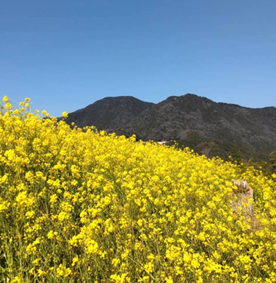 春、犬寄峠にある約2ヘクタールの丘が菜の花の黄色に染まります。